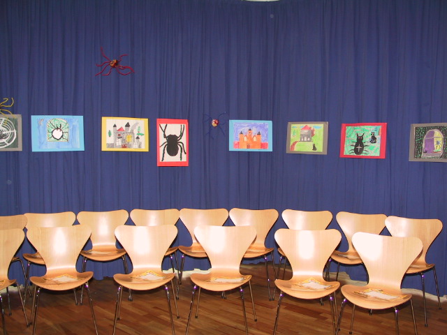 der 5b der Geistschule, die das alles gebastelt haben, machen vor lauter Aufregung die Stadtbücherei unsicher.