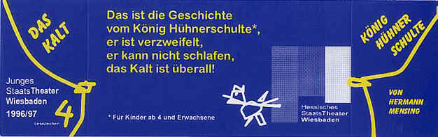 Der König ist es gewohnt, bedient zu werden. Und wenn es mal nicht ganz so klappt, denkt er sich Lösungen aus, bei denen es sich möglichst wenig anstrengen muß. Mit der Uraufführung von Hermann Mensings "König Hühnerschulte und das Kalt" in der Filmbühne Caligari - Regie führte Andrea Maria Erl - stellte das Junge Staatstheater Wiesbaden jetzt erstmals eine mobile Produktion vor. Sie wendet sich an Kinder von vier Jahren und an Erwachsene.