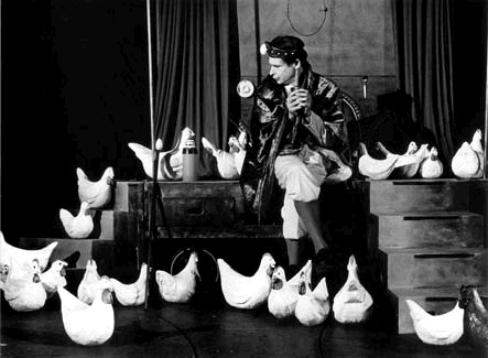 Das Reich des eigenwilligen Regenten paßt wirklich in zwei Karren. Die allerdings mausern sich gleich zu Beginn zu einer veritablen Bühne mit Hühnerstall (Ausstattung: R. Wust), der von den kleinen Zuschauern problemlos identifiziert wird. Denn alles scheint hier oval zu sein. Für die Launen des verwöhnten Machthabers wurde zusätzlich die Musikerin Annemarie Roelofs engagiert. Sie spielt nicht nur auf ihrer Geige, was den jungen Despoten - Helmut Kellner virtuos in mehreren Rollen - innerlich bewegt, sondern sie versteht sich auch auf die Hühnersprache.