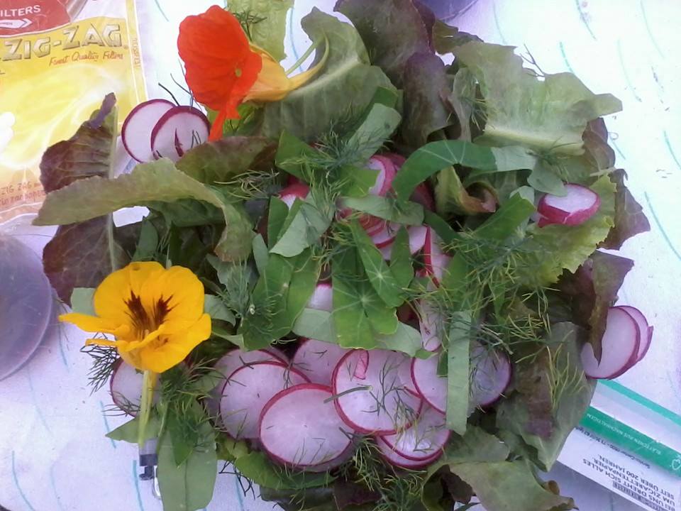 pfluecksalat, radieschen, dill, kapuzinerkresse plus bluete, avocado, balsamico, olivenoel, senf, honig, salz, pfeffer, joint