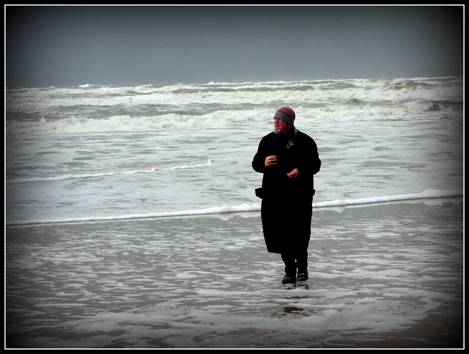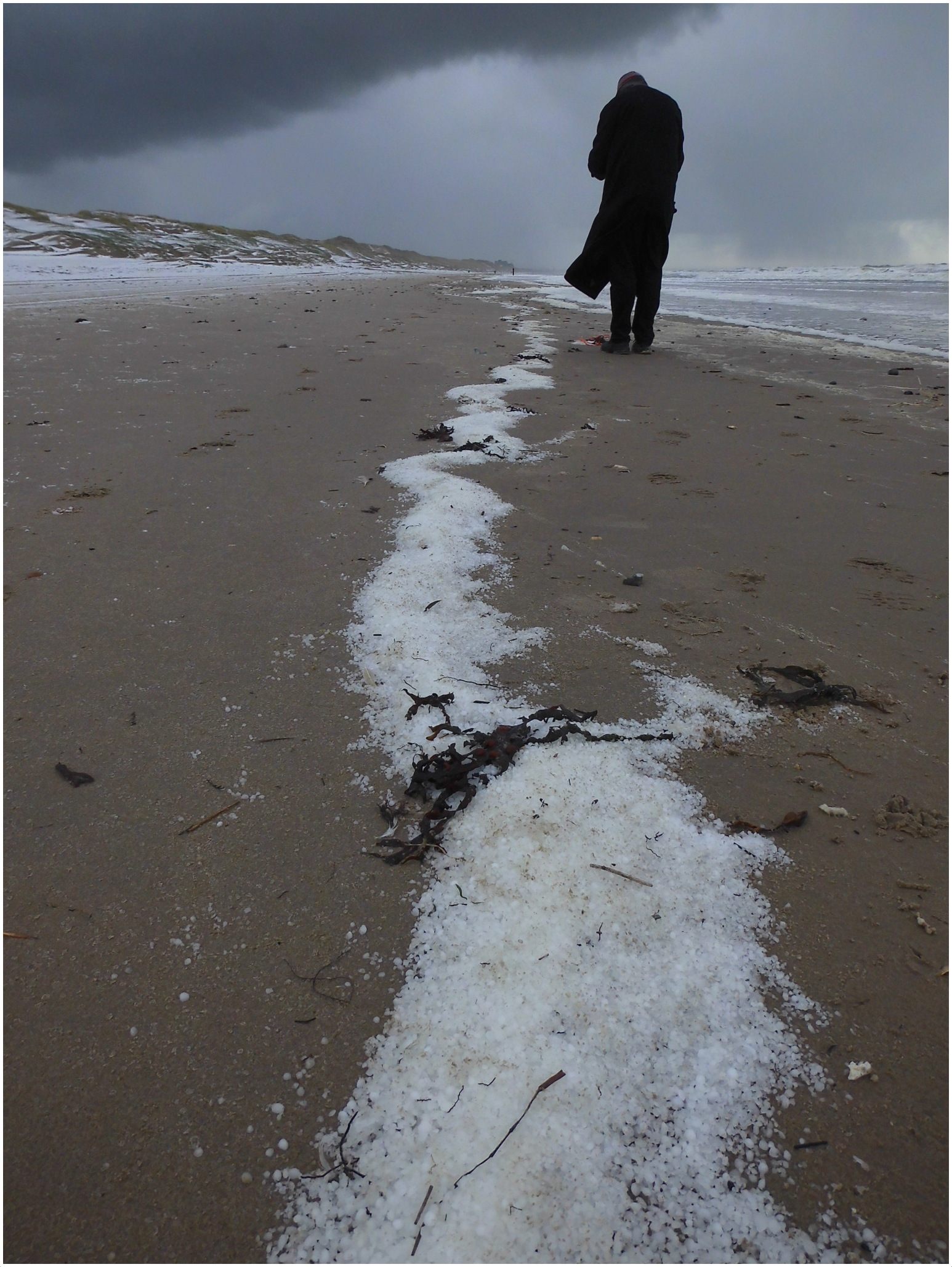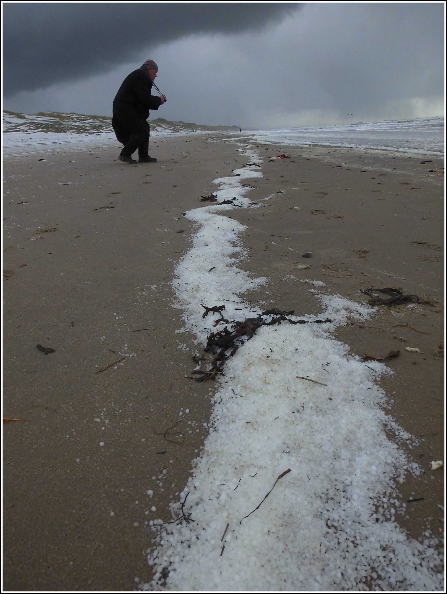 Wir waren die ersten im Frühstücksraum. Er ist ganz unten, mit Blick auf die Terrasse und die dahinter beginnenden Dünen. Der Kaffee war gut. Regen schlug gegen die Scheiben. M. schmierte uns Brötchen zum Mitnehmen. Wir gingen nach oben. Ich spielte Klavier. Es gibt im Erdgeschoss einen kleinen Raum zum Hof. Man blickt auf den Pool. Zwei Sessel stehen darin und ein leicht verstimmtes, halliges Klavier. Danach wieder ins Bett. Noch ein wenig schlummern. Dann blitzt es und donnert. Kurze Zeit später beginnt es zu hageln. Eine dreiviertel Stunde später hört es auf und wir gehen, den Wind im Rücken, über den Strand nach Egmond, vier, fünf Kilometer vielleicht. Unterwegs immer mal wieder Hagel, aber nie sehr lang. Kaum aber auf der Strandpromenade in Egmond beginnt sehr ergiebiger Hagel. Wir flüchten in eine kleine, fast quadritische, rundum verglaste Pommesbude auf der Düne. Das Meer schäumt wild. Die Wolken geben sich alle Mühe, uns zu beeindrucken. Wir essen ein bisschen, wir trinken Wasser, wir fragen, ob es Busse nach Bergen aan Zee gibt. Es gibt sie. Immer um Viertel nach. Man müsse aber winken, sonst führen die "Bastarde" einfach vorbei, sagt der Wirt, ein leutseliger Mann, der, fragt man ihn was, kaum wieder aufhört zu reden. Der Hagel hat unsere Wollmäntel feucht gemacht. Im Bus ist es warm. Der Busfahrer ist freundlich. Wieder zuhause lade ich die Fotos unseres Spazierganges von der Kamera auf den Rechner. Dann gehe ich Klavierspielen.
