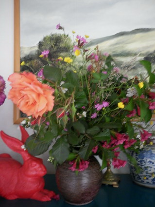 Als ich vorhin mit dem Rad über Land fuhr, habe ich Blumen gepflückt. Ich tu das für mein Leben gern, ich habe es meist für sie getan und für sie waren nur die schönsten Sträuße gut genug, aber der von heute ist ein Strauß für mich, denn sie ist ja nicht mehr auf der Welt, aber ich habe an sie gedacht. Klee ist dabei, Butterblumen sind auch dabei, Kuckucksnelken, die Orangebraunen kenne ich nicht, ich weiß nur, dass oft dicke schwarze Fliegen darauf sitzen, und der Name des Krauts, das so großdoldig weiß blüht, fällt mir auf Teufel komm raus nicht ein. Am Friedhof habe eine wilde Rose geklaut. Sie duftet, ist blutorange und hat mich gestochen.