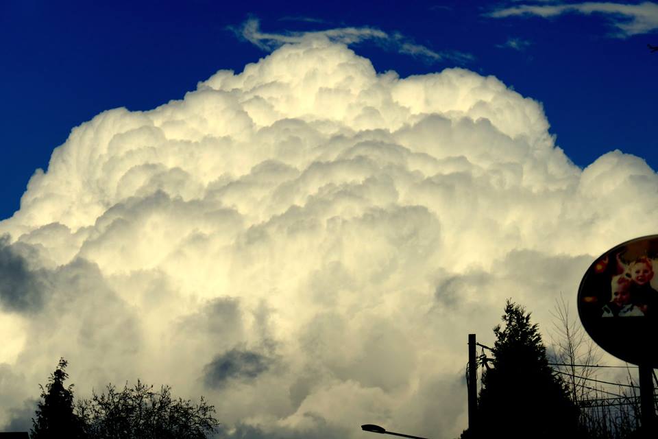Sonntagmorgen, keine Milch im Haus, Capuccino ohne Milch ist Frevel, also verließ ich das Haus, um beim Bäcker welche zu holen. Kaum vor der Tür sah ich diese gigantische Wolke, kehrte um und holte meinen Fotoapparat. Bis zum Bäcker sind es kaum fünfhundert Meter, die Wolke zeigte sich in Nuancen jeden Augenblick anders, ich fotografierte aus verschiedenen Perspektiven, kaufte Milch, und als ich heimkam, stellte ich fest, dass ich meinen Haustürschlüssel drinnen hatte stecken lassen, ich müsste also nur jemanden finden, der mir die Haustür öffnet. Ich schellte bei J., dessen Auto vor der Tür stand. Keine Reaktion. Ich schellte bei B. und bei P. Niemand zuhause. Ich musste durchs hintere Fenster einsteigen.