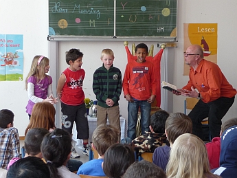 Herr Mensing gestaltete seine Lesung sehr lebendig und musikalisch untermalt mit Gesangseinlagen, die er auf seiner Ukulele begleitete. In den 1./2. Klassen las er aus seinem Buch 'Der zehnte Mond', in den 3./4. Klassen aus dem Buch 'Sackgasse 13' vor.