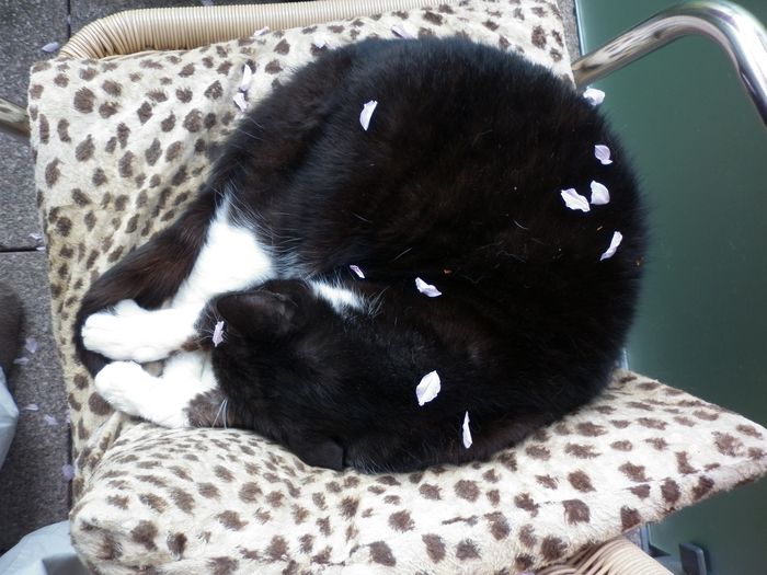 Wind kommt auf, Kirschblüten wehen, die Katze schläft.