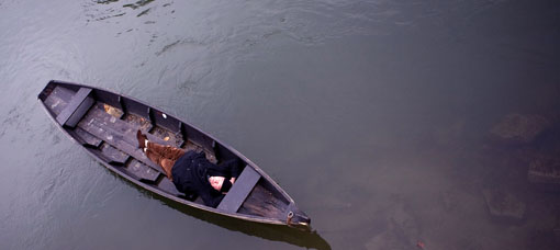 Er trifft seinen Verleger, sie beschnuppern sich, sie können miteinander, das wird bald klar, sie haben einen Draht, was immer wichtig ist, wichtiger fast als die Literatur, über die verhandelt werden soll, sie sind sich in Dingen eins, die nicht unbedingt gesagt werden müssen, weil sie sich eins sind. Bald kommt eine Fotografin und sie fahren gemeinsam zum Donaukanal. Das Licht, sagt die Fotografin, sei gerade recht, man will Fotos auf dem Wasser. Es liegt da ein Boot, ein schwarzes Ruderboot, auf dem steht Wiener Rettungszille, da hinein soll er sich legen, der Autor, während die Fotografin von allen Seiten fotografiert, dass es eine Art ist. Wasser: der Luganer See: die Katastrophe.