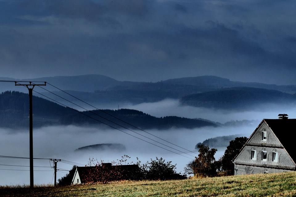 Man ist vier Tage fort, kehrt zurück, die erste Woche danach verfliegt, und man weiß kaum noch, was man wann wo tat. Man hat aber Fotos, man hat sein visuelles Gedächtnis auf die Festplatte verbannt, und darauf sind Berge zu sehen. Skulpturen nehmen Raum ein, Täler sind von Wolken verschluckt, Wälder sind so bunt, dass man sie nicht fotografieren kann, ohne dem Kitsch auf den Leim zu gehen. Wundervoller Kitsch. Man erinnert sich an Namen. Kühhude etwa, 700 Meter über NN., zwei Häuser ein Parkplatz am Ende einer sich parallel zu einem Bach durch ein Tal windenden kleinen Straße, Sackgasse, wo man zum ersten Mal mit dem Rothaarsteig in Kontakt tritt. Ja, sagen Wanderer, die Schanze und den Kyrill Pfad finden Sie, wenn Sie dort immer geradeaus gehen. Wir gehen und gehen. Wir kommen ins Schwitzen. Wir fragen uns, wieso die falschen Pfifferlinge wachsen, die richtigen aber nicht. Die Waden reißen. Am Abend kühlen wir sie mit Franzbranntwein. Komisch, sagt sie, wo du doch stundenlang tanzen kannst. Ja, sage ich (Herr M., man, er), komisch.Das Sauerland/Siegerland/Wittgensteiner Land ist kaum anderthalb Autostunden entfernt, und doch war ich nur als Kind dort, und später noch einmal, als ich in einer WG wohnte, die endlich einmal rodeln wollte, mit Kiffen und allem drum und dran, also richtige Abhänge voll Speed runternageln, nicht nur Kinderhügel wie in diesen Breiten. Damals stapften wir durch teils kniehohen Schnee, und waren bald bis auf die Knochen durchgefroren.