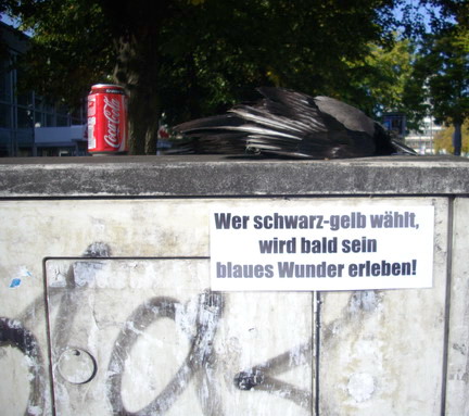 Irgendetwas Faszinierendes aber muss das haben für Mediziner, wenngleich ich nicht bestreite, dass ein ins Koma gelegter schon sehr entspannt liegt und diese Entspannung für den Heilungsprozess förderlich sein kann. Daher meine Forderung: legt ab sofort alle ins künstliche Koma, vor allem Investmentbanker, Derivathändler, Spekulanten, alle von der NPD/DVU, einfach ab damit ins Koma und schlafen lassen.Hier eine ins Koma gelegte Krähe.